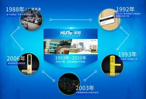 1988年,磁卡收費(fèi)有廣東電子研究所研發(fā);1992年廣東電子研究所磁卡識(shí)別技術(shù)應(yīng)用在民用門鎖。終于,在1993年,科裕企業(yè)克服重重難關(guān),自行研發(fā)的整套磁卡智能鎖上市,并參與國(guó)家相關(guān)部門的《磁卡識(shí)別標(biāo)準(zhǔn)》的起草,科裕智能鎖成為了中國(guó)第一個(gè)推出市場(chǎng)智能鎖的品牌。2003年,科裕智能鎖與韓國(guó)英特諾公司技術(shù)合作,2006年推出指紋識(shí)別智能鎖。