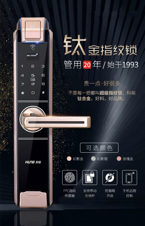 2017年,科裕智能鎖創(chuàng)造性推出鈦合金工藝。不但解決了智能鎖表面采用電鍍或噴漆工藝導(dǎo)致不很耐磨的問題,也解決了外觀表面光澤的問題,使智能鎖產(chǎn)品更科技時(shí)尚高大上。